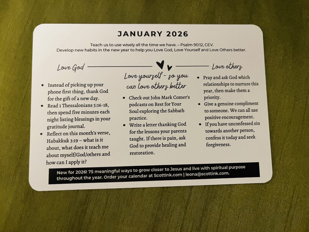 Surprise and delight your loved ones with a thoughtful gift that keeps on giving. This desktop calendar is an excellent choice for teachers, caregivers, ministry staff, Bible study friends, prayer partners, and anyone on your list who’s hard to buy for. Its versatility makes it the perfect option for gift exchanges and hostess gifts – a gift that will bless someone all year. On the back of each card, you can find tips for living more intentionally with a spiritual focus in the areas of Loving God, Loving Yourself, and Loving Others – 75 tips in all!